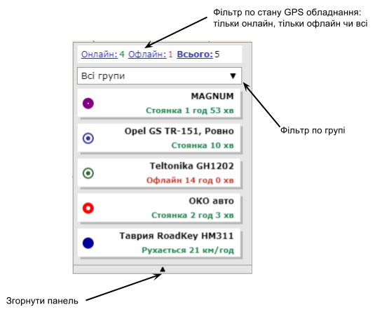 На панелі присутні два фільтри. Фільтр по стану GPS обладнання та фільтр по групах. Фільтр по стану дозволяє показати Всі об’єкти моніторингу, тільки ті, що зараз є на зв’язку з сервером чи тільки неактивні. Наприклад, декілька автомобілів знаходяться в ремонті і GPS обладнання обезструмлене, якщо Ви хочете бачити на екрані тільки реально працюючі авто, то можете натиснути “Онлайн”. Маркери непрацюючих приладів зникнуть з екрану.